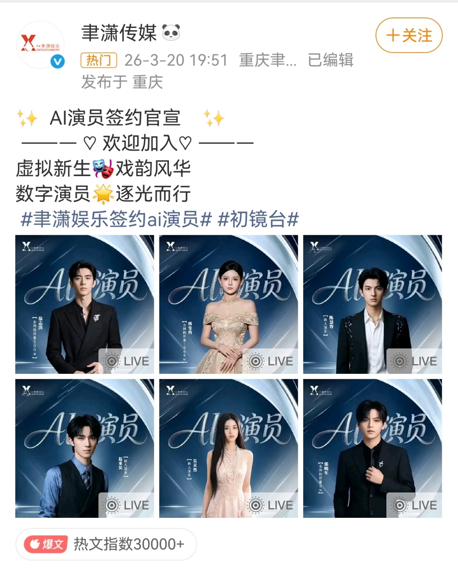 日前,耀客传媒和聿潇传媒陆续宣布签约AI演员,“男二以下都用AI演员”等话题登上热搜。有人觉得,AI演员尽管不会塌房,但说话时眼睛不眨、表情僵硬,有“恐怖谷效应”。也有人对AI取代人类本身感到抵触,“AI演员演戏,给AI观众看的吗?”有人甚至吐槽,“将来不如用AI小说改编成AI影视剧,给AI观众看,再让AI来写影评。”